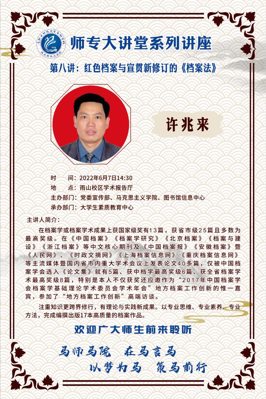 【师专大讲堂系列讲座海报】第八讲:红色档案与宣贯新修订的《档案法》