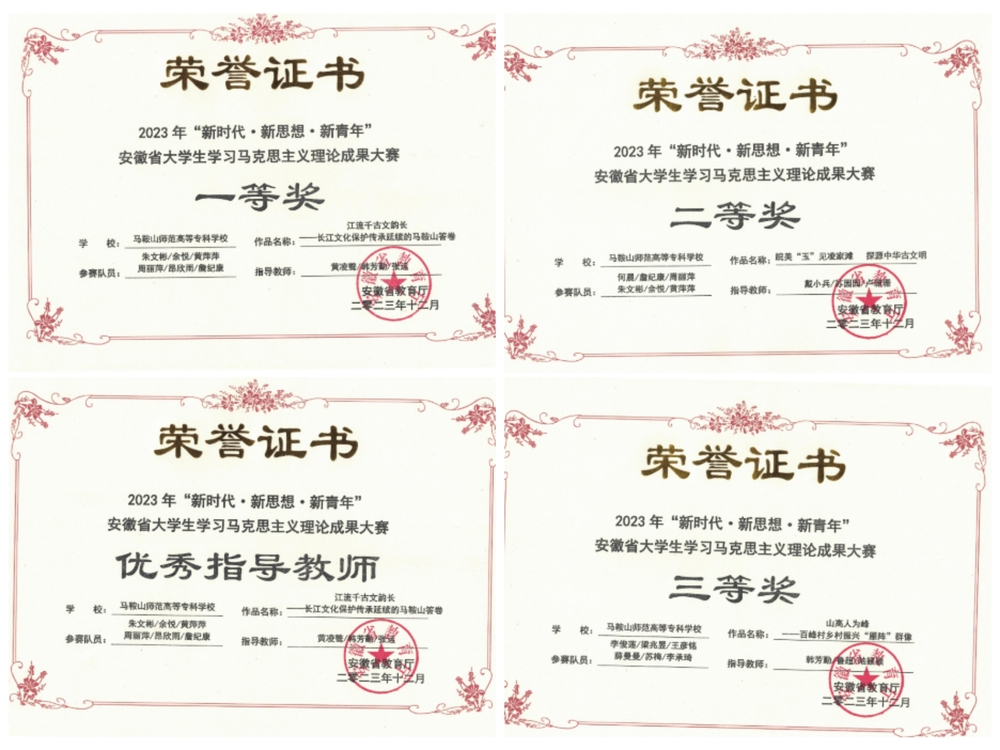 经校内选拔、省赛角逐,由黄凌骜、韩芳勤、张运三位老师指导的朱文彬等六位同学的微视频作品《江流千古文韵长——长江文化保护传承延续的马鞍山答卷》脱颖而出,荣获“微视频”一等奖。由戴小兵、苏园园、卢珊珊三位老师指导的何晨等六位同学的微视频作品《皖美“玉”见凌家滩 探源中华古文明》荣获“微视频”二等奖。由韩芳勤 鲁超 陆颖颖三位老师指导的李俊莲等六位同学的微视频作品《山高人为峰——百峰村乡村振兴“雁阵”群像》荣获“微视频”三等奖。